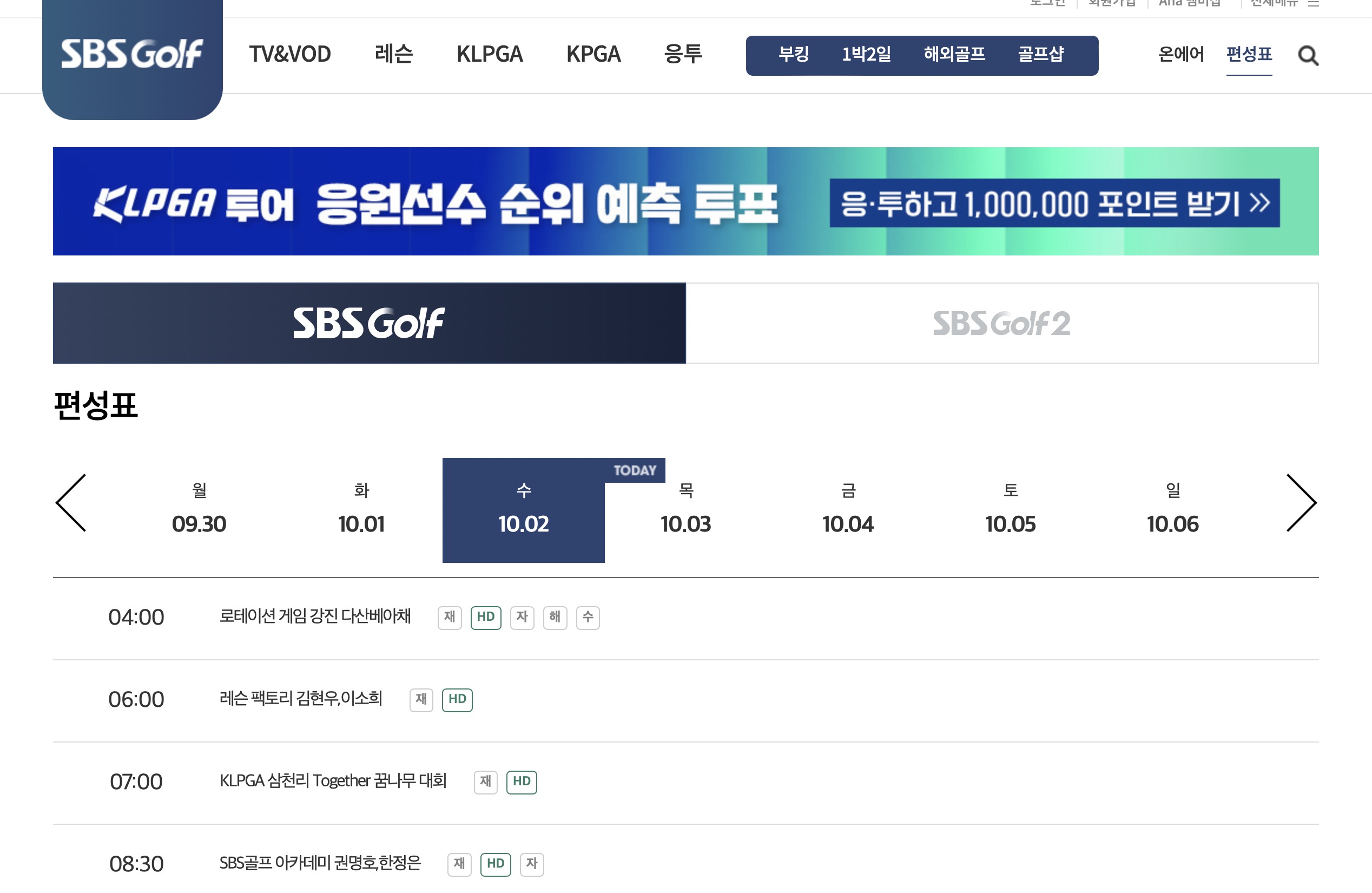 카테고리 없음 SBS골프 온에어 홈페이지 (https://golf.sbs.co.kr/) 김무치 2024. 10. 3. 13:15 반응형 SBS골프 홈페이지 https://golf.sbs.co.kr/main.html 편성표 정보 https://golf.sbs.co.kr/schedule.html SBS Golf : 편성표 SBS골프 TV편성표 golf.sbs.co.kr 온에어 https://golf.sbs.co.kr/onair.html SBS Golf : 온에어 KLPGA 독점생중계 golf.sbs.co.kr 반응형 공유하기 게시글 관리 대영제국 저작자표시 (새창열림)